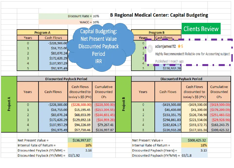 Calculated Medical Center's Net Present Value, Payback period, Discounted Payback Period for 2 projects. Made a presentation comparing 2 Projects.